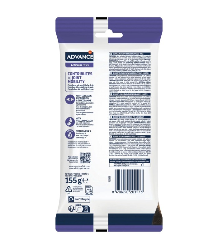 ADVANCE Articular Stick ayuda a mejorar la movilidad articular de tu perro, con resultados visibles en 6 semanas, gracias a su fórmula exclusiva con ácido hialurónico y Omega-3 que contribuyen a mantener las articulaciones de tu perro correctamente lubricadas y a devolver la movilidad. Además, contienen colágeno, condroitina y glucosamina que contribuyen a estimular el metabolismo del cartílago, lo que ayuda a ralentizar su desgaste