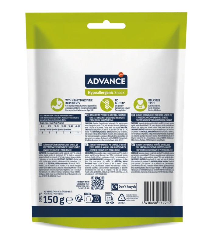 ADVANCE Hypoallergenic Snack es una galleta blanda y apetitosa con una fórmula exclusiva, elaborada sin ingredientes que puedan producir reacciones adversas al alimento.Gracias a la proteína hidrolizada y a los carbohidratos puros sin residuos protéicos, reduce el riesgo de reacciones alérgicas al alimento, y además favorecen la digestión y la asimilación correcta de los nutrientes
