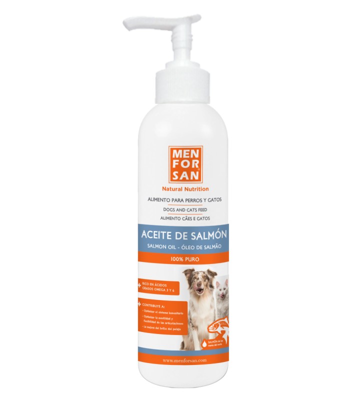 Aceite de salmón de primera calidad para perros y gatos. Enriquece la dieta diaria gracias a su alto contenido en ácidos grasos Omega-3 y Omega-6 . Estos ácidos grasos proporcionan brillo al pelaje , apoyan el sistema inmunológico y fortalecen las articulaciones y los huesos.