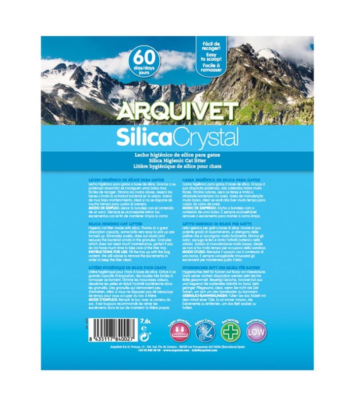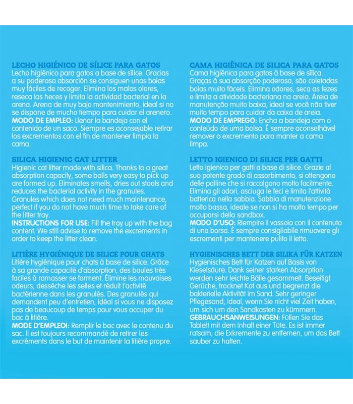 Lecho higiénico para gatos a base de arena de sílice. Tiene una gran capacidad absorbente, absorbiendo los malos olores y ayudando a eliminar las bacterias