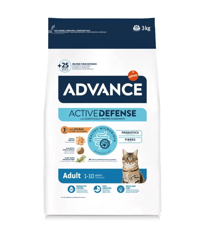 Advance Adult es una sabrosa receta de alta que calidad que cubre las necesidades de los gatos adultos. Está elaborada con pollo como primer ingrediente, es fácil de digerir, y ayuda a controlar el pH urinario gracias a sus niveles equilibrados de sustancias minerales. También contribuye al cuidado de la piel y el pelo gracias a los ácidos grasos omega 3 y omega 6, y al zinc. El tamaño de su croqueta se adapta a la mandíbula de los gatos adultos.