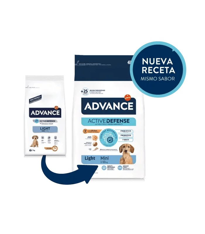 Advance Adult Mini Light es un alimento para perros con tendencia al sobrepeso. Gracias a su fórmula baja en grasas, ayuda a controlar su peso. Su alto nivel de fibra y proteína ayudan a saciar el apetito y a mantener la masa muscular.