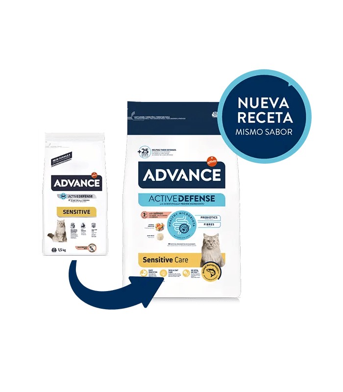 Advance Adult Sensitive Care está especialmente indicado para ayudar a la digestión de los gatos adultos. Está elaborado con salmón como única fuente de proteína animal y con arroz. Una receta monoprotéica animal fácil de digerir, formulada sin ingredientes que contienen gluten, soja o huevo soja ni huevo. Además, contribuye a una piel saludable y un pelo brillante gracias a los ácidos grasos omega 6 y 3, y al zinc. El tamaño de su croqueta se adapta a la mandíbula de los gatos adultos.