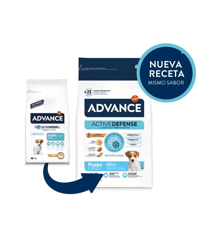 Advance Puppy Mini está específicamente formulado para cubrir las necesidades nutricionales de los cachorros. Es un alimento fácil de digerir que contribuye al normal desarrollo del cerebro y la visión y al óptimo crecimiento de los huesos, gracias a los ácidos grasos omega-3, vitaminas y minerales. Incorpora nucleótidos que ayudan a mantener la respuesta inmunológica natural.