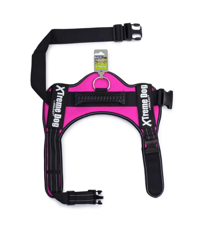 Arnés para perros extra resistente, ergonómico y ajustable en cuello y barriga mediante velcro y cierre de plástico. Fabricado en poliéster, con anilla de acero inoxidable para atar la correa y un asidero de plático para agarrarlo manualmente.