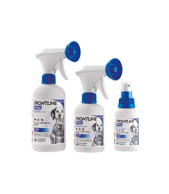 INDICACIONES: - Tratamiento y prevención de las infestaciones por pulgas (Ctenocephalides spp) y garrapatas (Ixodes ricinus y Rhipicephalus sanguineus) en el perro. - Tratamiento y prevención de las infestaciones por pulgas (Ctenocephalides spp) y garrapatas (Rhipicephalus spp, Ixodes ricinus, Ixodes scapularis, Dermacentor variabilis) en el gato. - Frontline Spray elimina las pulgas del animal tratado, por lo que puede ser utilizado como parte de la estrategia en el tratamiento de la Dermatitis Alérgica por Pulgas (DAP). - Tratamiento y control de las infestaciones por piojo picador (Trichodectes canis) en el perro y (Felicola subrostratus) en el gato. POSOLOGÍA Y MODO DE ADMINISTRACIÓN: - Vía de administración: externa, por pulverización. - Aplíquese 3 a 6 ml/kg de peso vivo (equivalente a 7,5 a 15 mg de fipronilo/kg, dependiendo de la longitud del pelo del animal: 3 ml/kg de peso vivo para animales de pelo corto y hasta 6 ml/kg para animales de pelo largo), es decir de 2 a 4 pulverizaciones/kg de peso para el spray de 250 ml y el de 500 ml y 6 a 12 pulverizaciones/kg para el spray de 100 ml. - Como parte de la estrategia en el tratamiento de la Dermatitis Alérgica por Pulgas (DAP) se recomienda una aplicación mensual en los animales alérgicos y en los que convivan con ellos. - El medicamento es activo durante 2 meses frente a pulgas y durante 4 semanas frente a garrapatas. - El tratamiento frente a garrapatas se hará como mínimo una vez al mes. - Frente a piojos, en caso necesario, volver a tratar al animal a las 4 semanas de realizada la primera aplicación. - En ausencia de estudios de seguridad, el intervalo mínimo de tratamiento es de 4 semanas. - A fin de que el pelo quede totalmente mojado: Pulverizar toda la superficie del animal manteniendo el frasco a una distancia de 10-20 cm. - Repartir de manera uniforme y a contrapelo para que todo el animal quede mojado. - Friccionar después de la aplicación para que el medicamento penetre hasta la piel. - Dejar que el medicamento se seque de forma natural. No secar con toalla