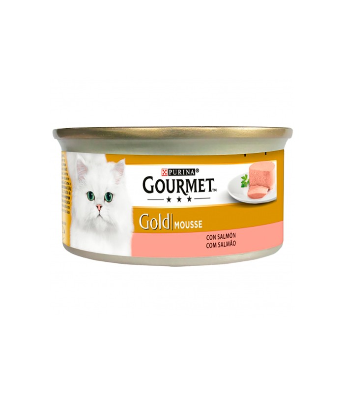 BENEFICIOS: GOURMET GOLD Mousse Salmón Deliciosos trocitos de salmón envueltos en una suave y gustosa mousse, preparada para ofrecer a tu gato el placer de una delicada y suave sensación