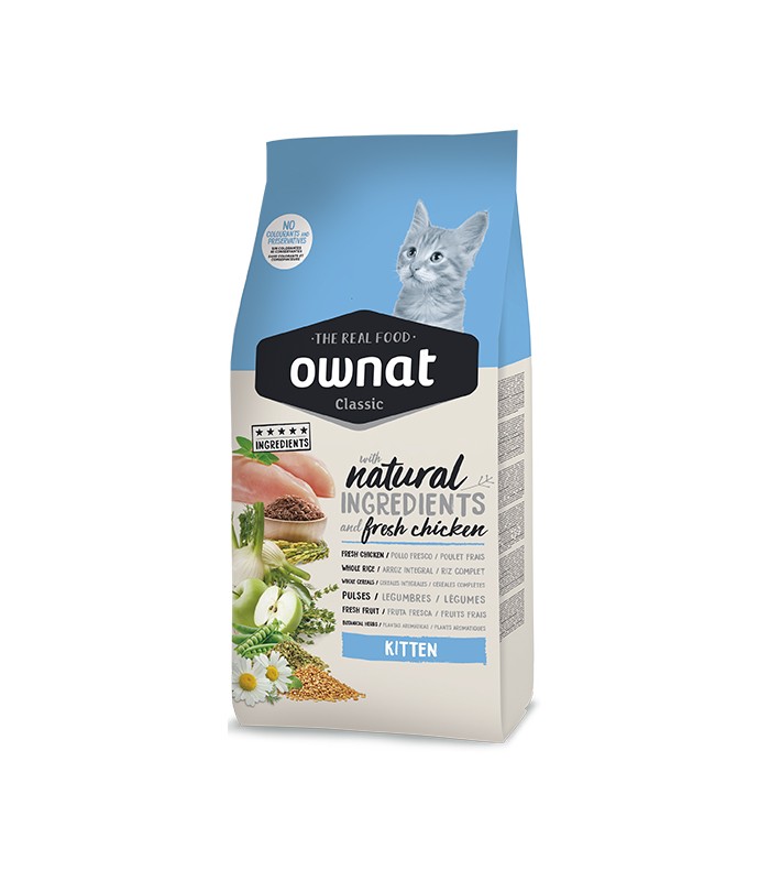 Indicado para gatitos de 1 a 12 meses, esta formulado con altos niveles calóricos y proteicos para dar respuesta a los elevados requerimientos de su organismo en desarrollo. Con una especial atención a la seguiridad digestiva gracias a las proteínas de la carne fresca y a los fructo y manano oligosacáridos que favorecen el equilibrio intestinal. • Beneficios En Ownat, elaboramos nuestras recetas con ingredientes naturales y con carnes frescas de verdad, con todo su contenido nutritivo intacto. Sin colorantes, ni conservantes, ni aditivos artificiales. La carne fresca aporta proteínas de alto valor biológico al contener todos los amioácidos esenciales y ser las de mayor digestibilidad. El arroz integral, también ayuda a una alta digestibilidad La fruta fresca es antioxidante Los cerales integrales aportan fibra natural que mejora los movimientos intestinales Las plantas aromáticas, contribuyen al bienestar digestivo Las legumbres, proporcionan proteínas y vitaminas vegetales La semilla de lino cuidan la piel y el pelo, además de omega 3-6 La levadura de cerveza, proteje el sistema inmunitario • Ingredientes Carnes 38% (carnes deshidratadas 28%, pollo fresco* 10%), arroz integral* (15%), grasa de pollo, cebada integral* (9%), maíz integral* (7%), proteína de maíz, guisantes enteros* (4%), pescado deshidratado, levadura de cerveza* (1,5%), proteína hidrolizada de pollo, huevo entero deshidratado* (1%), manzana fresca* (1%), aceite de salmón, pulpa de remolacha, fructo y manano oligosacáridos, hierbas botánicas 0,02% (hinojo*, flor de manzanilla*, anís verde*), yucca schidigera