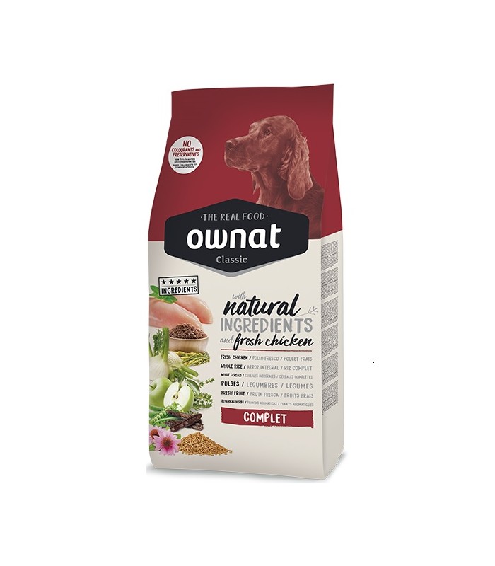 Alimento completo y equilibrado, con un excelente sabor gracias a la incorporación de carne fresca. Diseñado para cubrir todas las necesiaddes nutricionales de un perro adulto con un nivel de actividad normal, sea cual sea su raza y su tamaño. • Beneficios En Ownat, elaboramos nuestras recetas con ingredientes naturales y con carnes frescas de verdad, con todo su contenido nutritivo intacto. Sin colorantes, ni conservantes, ni aditivos artificiales. La carne fresca aporta proteínas de alto valor biológico al contener todos los amioácidos esenciales y ser las de mayor digestibilidad. El arroz integral, también ayuda a una alta digestibilidad La fruta fresca es antioxidante Los cerales integrales aportan fibra natural que mejora los movimientos intestinales Las plantas aromáticas, contribuyen al bienestar digestivo Las legumbres, proporcionan proteínas y vitaminas vegetales La semilla de lino cuidan la piel y el pelo, además de omega 3-6 La levadura de cerveza, proteje el sistema inmunitario • Ingredientes Carnes 32% (carnes deshidratadas 22%, pollo fresco* 10%), trigo integral* (18%), grasa de pollo, maíz integral* (9%), cebada integral* (8%), guisantes enteros* (5%), salvado de trigo* (5%), arroz integral* (5%), garrofa* (2%), manzana fresca* (1%), aceite de salmón, semilla de lino* (1%), pulpa de remolacha, fructo y manano oligosacáridos, levadura de cerveza* (0,5%), hierbas botánicas 0,02% (hinojo*, equinacea*, tomillo*), yucca schidigera