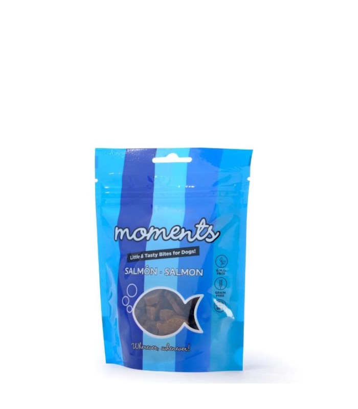 Moments snack para perro sabor Salmon son unas deliciosas chuches con divertidas formas muy sanas que ayudan a mantener una salud de hierro. Elaboradas con productos de cercanía en España garantizan la más alta calidad, proporcionando un sabor exquisito, libre de cualquier clase de aditivo artificial. Incluye un 70% de salmón fresco que aporta ácidos grasos Omega 3, reforzando las defensas de su piel y favoreciendo un pelaje brillante. Los snacks hipoalergénicos que permiten a tu mascota disfrutar de una digestión fácil.