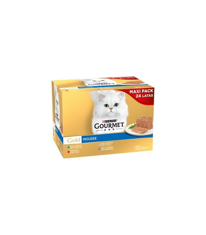CARACTERÍSTICAS: Tu gato es un verdadero experto y le gusta probar diferentes texturas y sabores cada día. Por eso GOURMET Gold ha creado Mousses , sabrosas recetas para mimar su sofisticado paladar con una experiencia diferente de sabor en cada comida. INGREDIENTES: *Con Ternera: Carnes y subproductos animales (de los cuales ternera 4%), sustancias minerales, Subproductos de origen vegetal, azúcares * Con Buey: Carnes y subproductos animales (de los cuales buey mín. 4%), Subproductos de origen vegetal, Sustancias minerales, azúcares. * Con Cordero: Carnes y subproductos animales, (de los cuales cordero 4%), Sustancias minerales, Subproductos de origen vegetal, Azúcares. *Con Conejo: Carnes y subproductos animales, (de los cuales conejo 4%), Sustancias minerales, Azúcares, Subproductos de origen vegetal, Azúcares. RACIÓN DIARIA Y MODO DE EMPLEO: - Para un gato adulto medio (4kg) servir 4 latas al día en al menos 2 comidas separadas. - Las necesidades individuales varían y la cantidad de alimento debería ajustarse convenientemente para mantener a su gato en un peso corporal magro y saludable. - Para gatas gestantes o lactantes: dejar comer a voluntad. - Servir a temperatura ambiente.