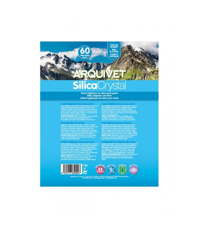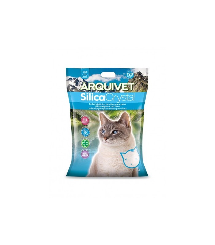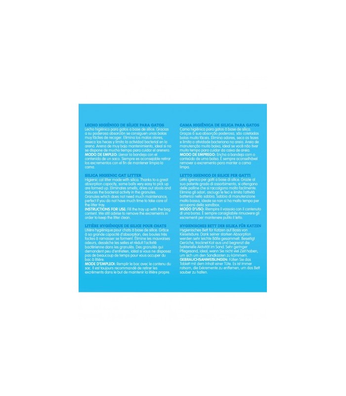 Lecho higiénico para gatos a base de arena de sílice. Tiene una gran capacidad absorbente, absorbiendo los malos olores y ayudando a eliminar las bacterias